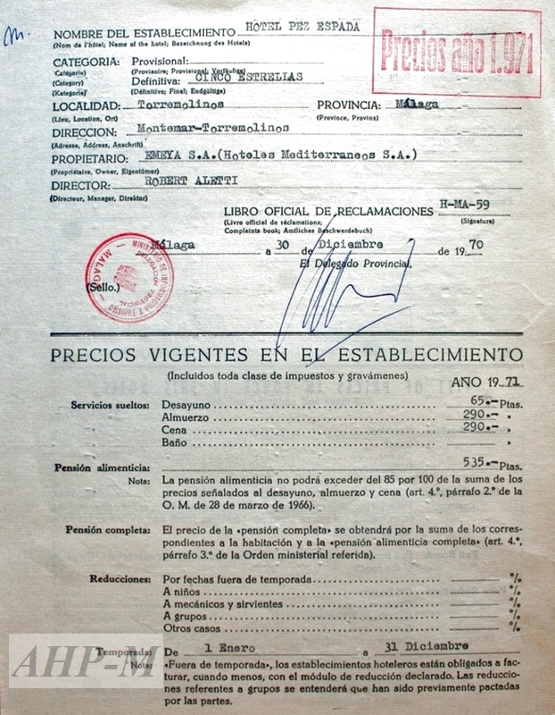 1970, diciembre, 30. Málaga. Archivo Histórico Provincial de Málaga. Delegación Provincial de Información y Turismo. Sig. 73.073. Hotel Pez Espada de Torremolinos. Impreso de dos hojas plegado, en cuatro idiomas. Observ.: Detalle de los precios vigentes en el hotel para el año 1971, incluyendo los datos básicos de la empresa, categoría cinco estrellas, propietario: EMEYA, S.A., y director: Robert Aletti. Fija precios para las habitaciones y los servicios de hostelería. JAV.