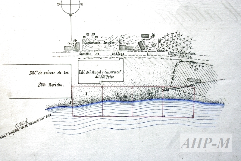 1874, abril, 11. Málaga. Archivo Histórico Provincial de Málaga. Jefatura de Minas. Sig. 8923. Demarcación del escorial de hierro titulado San Miguel, nº 823 en las Playas de la Caleta de Málaga. Expediente; plano de demarcación y cuaderno de brújula. Cuaderno de brújula; manuscrito. Observ.: se representan en el plano las fábricas de azúcar de los Sres. Heredia, la del Ángel del Sr. Pries y el Cementerio Inglés. MFE.