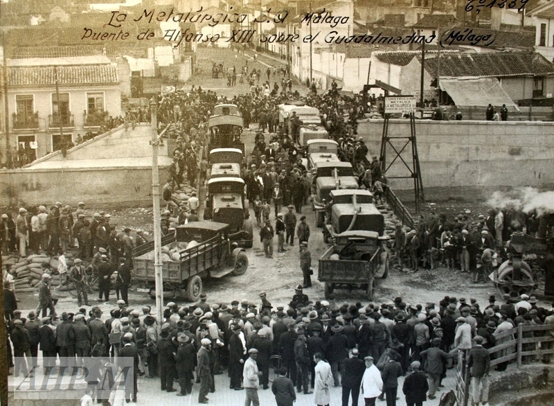 [1930]. Málaga. Archivo Histórico Provincial de Málaga. Archivo de La Metalúrgica. Sig. FOT 597/59 (Álbum). Pruebas de carga del puente de la Aurora. Fotografía; b/n. Observ.: El tramo metálico del Puente, entonces llamado de Alfonso XII, fue adjudicado por concurso a la empresa La Metalúrgica. Las pruebas de resistencia se realizaron en la primavera de ese año: primero se colocaron sacos de arena y luego, se hizo una prueba en movimiento, con el paso de tres filas de vehículos. ADS.