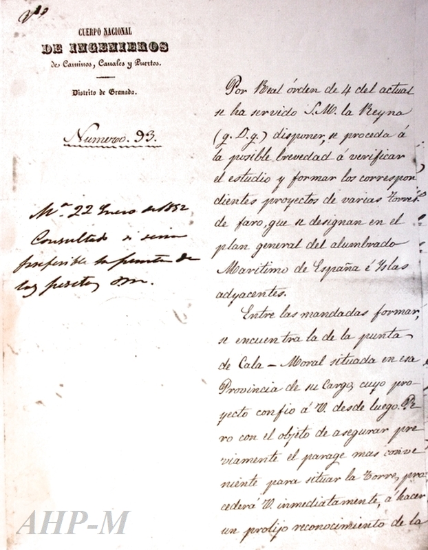 1851 - 1852. Málaga. Archivo Histórico Provincial de Málaga. Demarcación de Costas. Sig. 73.976/35. Los ingenieros de Caminos, Canales y Puertos, uno el Jefe del Distrito de Granada y el otro con sede en Málaga, inician los trabajos de búsqueda de un paraje idóneo para ubicar un faro en la zona de la Cala-Moral y Cala-Burras, para dar cumplimiento al Plan General de Alumbrado Marítimo de España e Islas adyacentes, aprobado por la Real Orden de 4 de diciembre de 1851. Oficio. JAV.