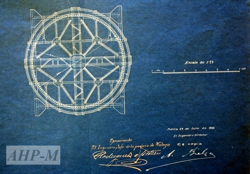 1916, julio, 29. Melilla. Archivo Histórico Provincial de Málaga. Delegación Provincial de Obras Públicas y Transportes. Sig. 25.137/4. Proyecto del concurso para la reconstrucción de la grúa Titán, de 80 toneladas, del puerto de Melilla. Plano (detalle 2); copia azográfica; escala 1:75; autor del proyecto: ingeniero J. Álvaro Bielza y Romero; examinado por el Ingeniero Jefe de la provincia de Málaga. JAV.