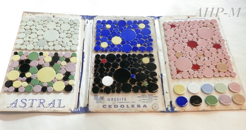 [1958]. Valencia. Archivo Histórico Provincial de Málaga. Archivo José González Edo. Sig.OBJ 05/03. Muestrario de gresite, Astral constelación. Muestra de azulejos. Observ.: tríptico de muestras de diferentes colores, fabricado por CELODE SA, empresa valenciana, es utilizado como herramienta de trabajo por el arquitecto para el diseño de sus proyectos. MFE.