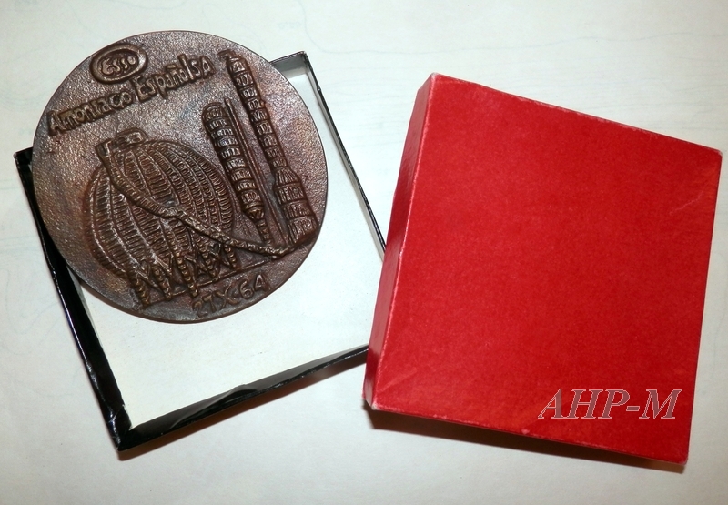 1964, octubre, 27. Málaga. Archivo Histórico Provincial de Málaga. Sección Registro Industrial. Sig. OBJ 02/01. Medalla conmemorativa que representa la fábrica de Amoniaco Español (ESSO) de Málaga. Medalla; metal. Observ.: en el reverso se representa la imagen del Cenachero de Málaga. MFE.