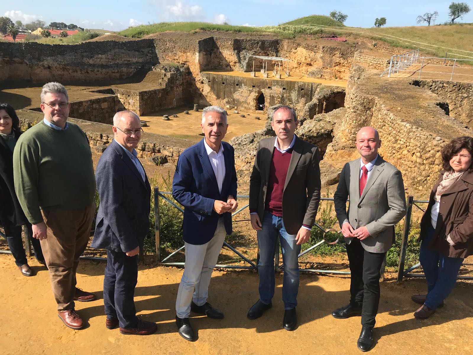 El consejero de Cultura, con el director del conjunto y otras autoridades, durante su visita a Carmona.