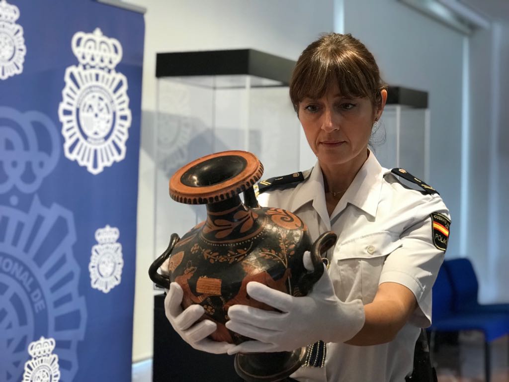 Una agente de la Policía Nacional muestra una de las piezas recuperadas.