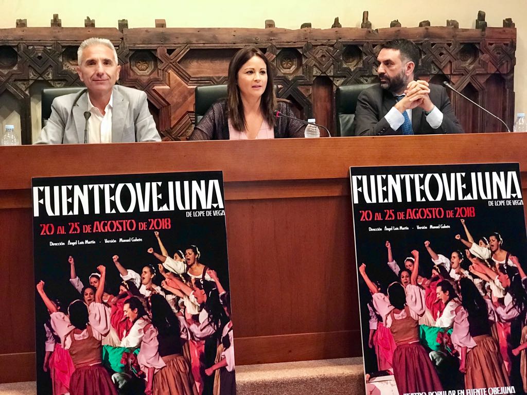 El consejero de Cultura, Miguel Ángel Vázquez, y el consejero de Turismo y Deporte, Francisco Javier Fernández, han presentado hoy en Sevilla el cartel de la representación teatral de la clásico ‘Fuenteovejuna’, de Lope de Vega. La obra, en la que participan entre actores, figurantes y voluntarios más de 300 personas del pueblo, podrá verse en la plaza principal del municipio cordobés de Fuente Obejuna del 20 al 25 de agosto.