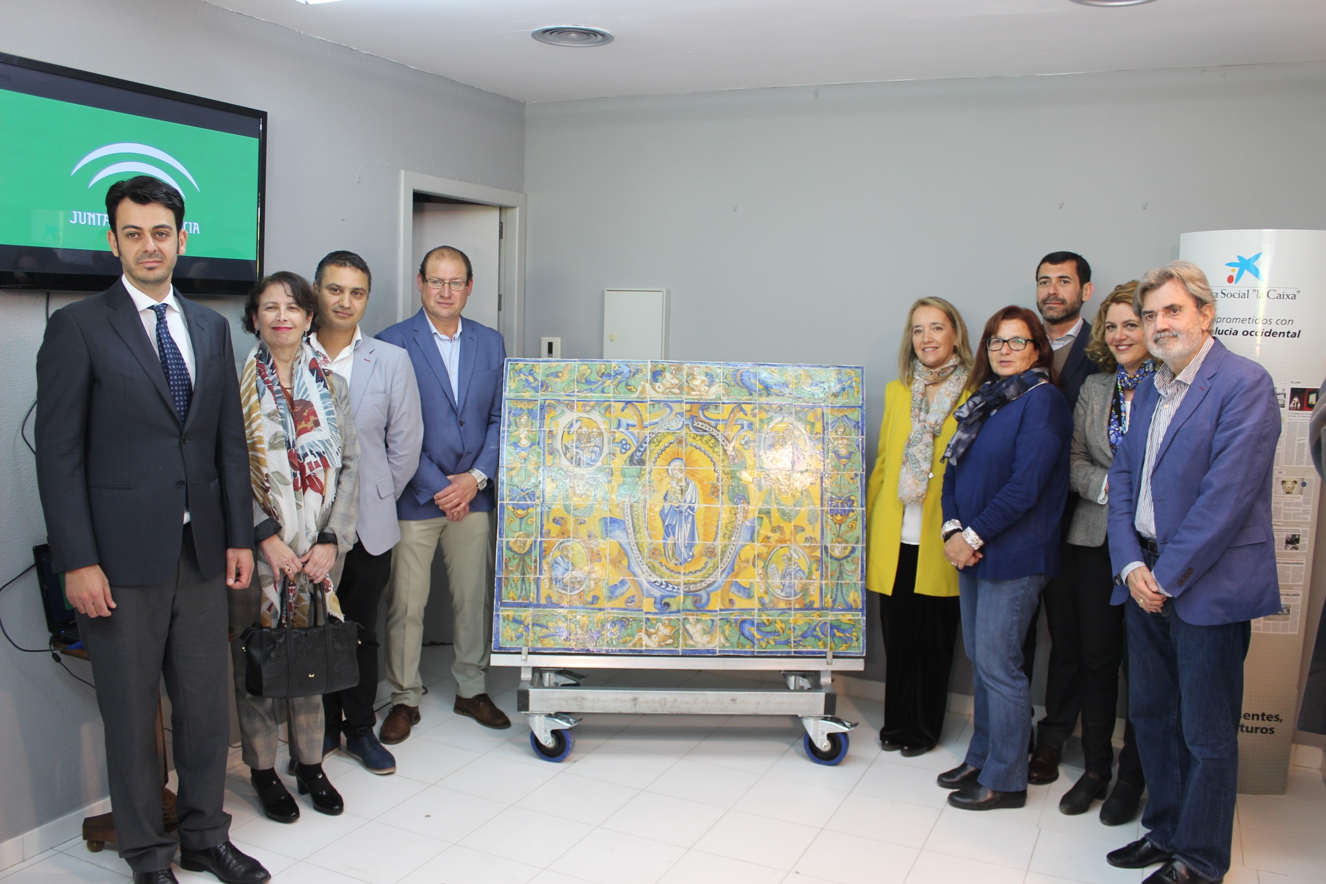 La secretaria general de Patrimonio Cultural, Macarena O’Neill, ha presentado esta mañana, junto al alcalde de Bollullos de la Mitación, Fernando Soriano, y al Hermano Mayor de la Hermandad de Cuatrovitas, Pedro Moreno, el resultado de la intervención realizada por el Instituto Andaluz de Patrimonio Histórico (IAPH) en el altar cerámino de la ermita de Cuatrovitas. Este frontal de altar es un mural de azulejo pintado cuya fecha de ejecución se estima en la segunda mitad del siglo XVI y del que se desconoce su autoría.