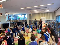 Un grupo de escolares participa en el encuentro celebrado con el escritor Fran Nuño en la Biblioteca Infanta Elena