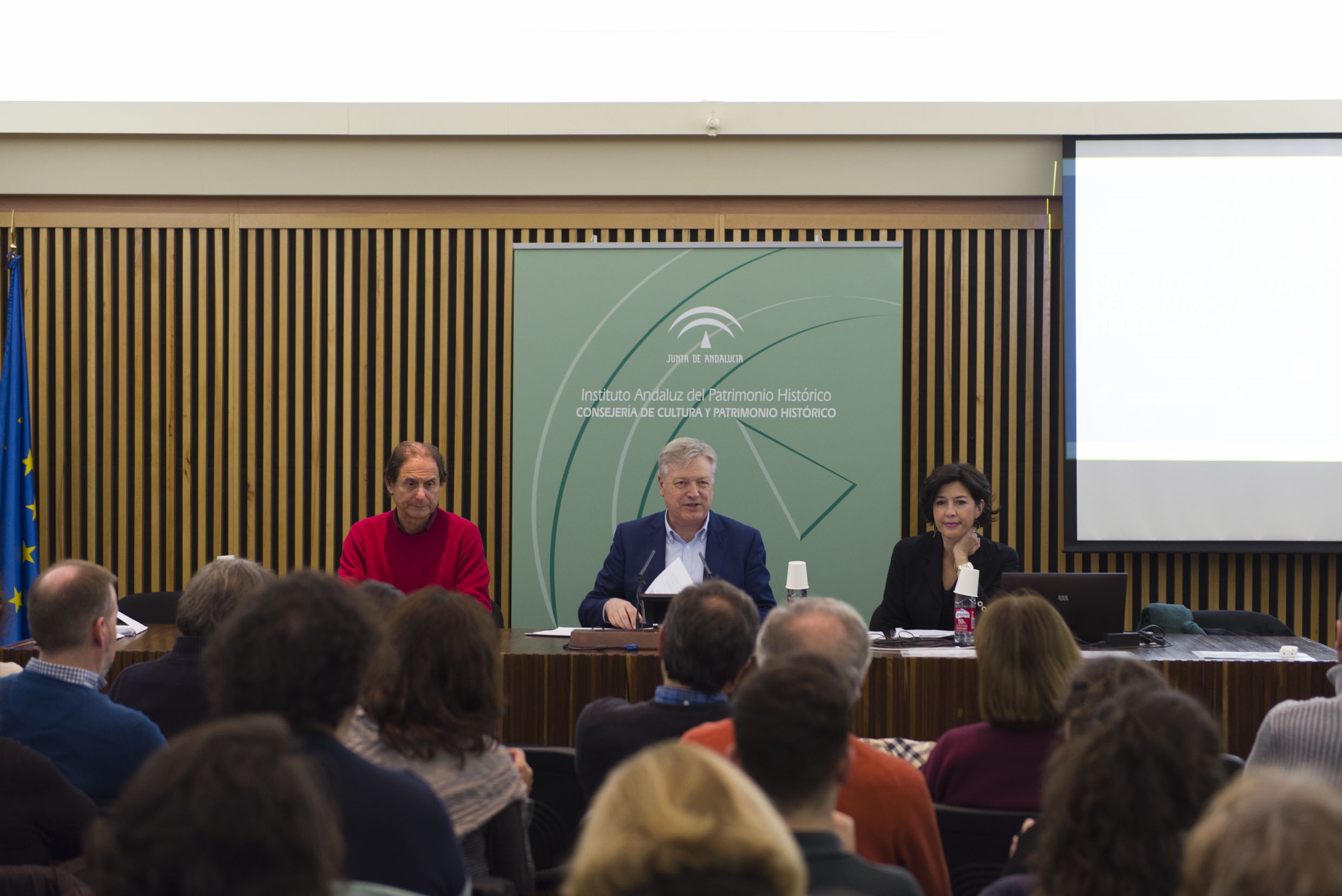 De izquierda a derecha, Carlos Romero Moragas, Jefe del Centro de Formación y Difusión del IAPH; Juan José Primo Jurado, Director del IAPH; y Marta Sameño Puerto, Doctora y bióloga del Área de Laboratorios del IAPH