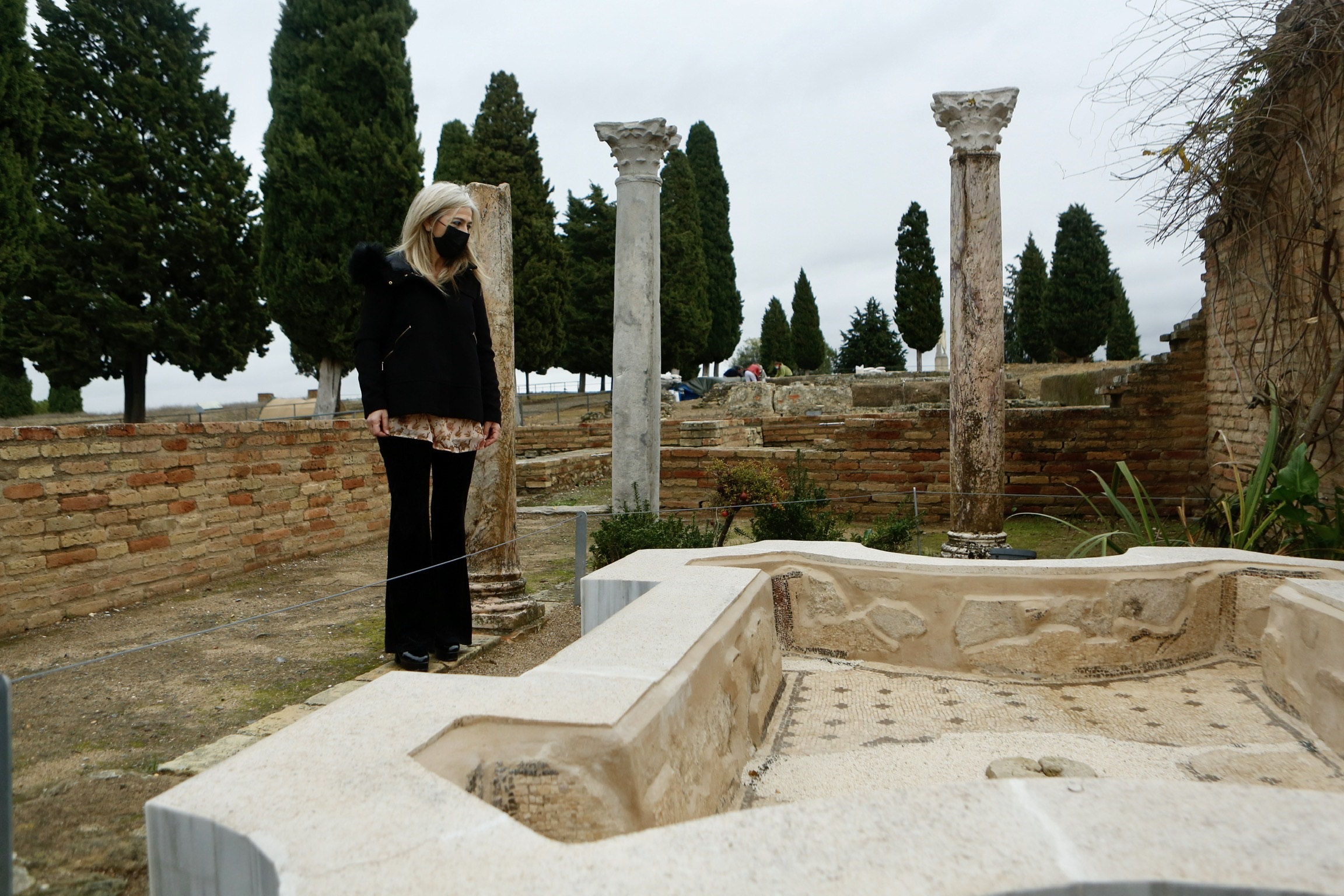 La consejera de Cultura y Patrimonio Histórico, Patricia del Pozo, observa los trabajos de recuperación en el Conjunto Arqueológico de Itálica