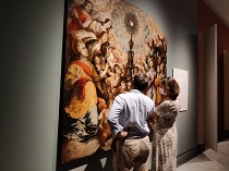 El Museo de Bellas Artes de Sevilla acoge en el programa ‘La obra invitada’ el lienzo de Francisco Herrera el Viejo ‘La exaltación de la eucaristía’ (1641), propiedad de la archicofradía sacramental de las Siete Palabras, con ocasión de su retirada de su emplazamiento sobre el arco de la puerta de la capilla sacramental de la iglesia de San Vicente de Sevilla ‒a nueve metros de altura‒ para su restauración, ya concluida.