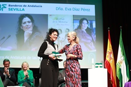 La Bandera de Andalucía de las Ciencias Sociales y las Letras recae este año en Eva Díaz Pérez. Periodista, escritora, académica numeraria de la Real Academia Sevillana de Buenas Letras, miembro de la Real Academia Hispano Americana de Ciencias, Artes y Letras de Cádiz, fue también directora del Centro Andaluz de las Letras. Ha sido con sus libros finalista del Premio Nacional de Periodismo, Premio Unamuno, Premio El Público de Canal Sur Radio y Televisión a la Cultura Andaluza, finalista del Premio Nadal, VII Premio Málaga, Premio Literario Feria del Libro de Sevilla o Premio Andalucía de Periodismo, entre otras distinciones. Interesada por figuras como Bartolomé Esteban Murillo o el humanista Antonio de Nebrija, también destaca por sus ensayos y sus trabajos colaborativos sobre teatro o la Semana Santa sevillana.