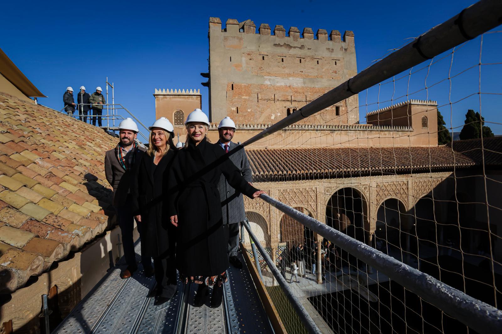 La consejera de Cultura y Deporte, Patricia del Pozo, ha visitado esta mañana las obras en curso de restauración de las cubiertas del Mexuar y de los Palacios Nazaríes en la Alhambra de Granada, “una ambiciosa intervención que tiene como objetivo garantizar la estabilidad, estanqueidad y conservación de una de las zonas más delicadas y valiosas del conjunto palaciego”, ha señalado Del Pozo, quien ha avanzado, que la actuación “avanza según la planificación prevista, de modo que podrá estar completamente concluida en el verano de 2026”.