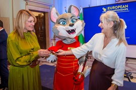 Durante el acto también se ha presentado la mascota del campeonato europeo, que representa a una loba, animal con el que Carolina Marín siempre se ha identificado mucho al representar garra, fuerza, lo que siempre ha caracterizado también a la deportista onubense. Va vestida de forma muy parecida a la vestimenta que lució la jugadora andaluza en la final de los Juegos Olímpicos de Río 2016, en la que se proclamó campeona, y su nombre es Luz, que se identifica también con la Costa de la Luz onubense y la luz de Huelva.