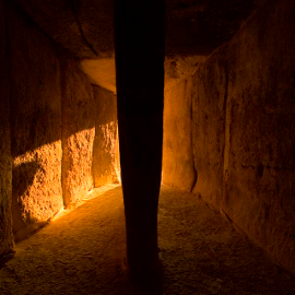 Tholos de El Romeral El tholos de El Romeral es un típico sepulcro de falsa cúpula. Tiene un corredor de paredes de mampostería y cubierta adintelada que conserva 11 losas, con una longitud máxima conservada de 26.30 m, una anchura media de 1.50 m. y una altura media de 1.95 m. La cámara, con la típica cubierta de falsa cúpula, tiene sus paredes ligeramente abovedadas, elaboradas en mampostería que terminan en una losa horizontal; es de planta circular, con 5.20 m. de diámetro y 3.75 m. de altura. Al fondo de esta cámara se abre un vano que da acceso a un pequeño corredor que termina en una camarita, reproduciendo, a menor escala, la morfología y la técnica constructiva señaladas anteriormente. La longitud total conservada del sepulcro supera ligeramente los 34 m. El tholos se cubre con un túmulo y está orientado sorprendentemente a un acimut de 199º, es decir, en el octante S-SO del horizonte y es uno de los poquísimos ejemplos de orientación a la mitad occidental del cielo en toda la Península Ibérica.