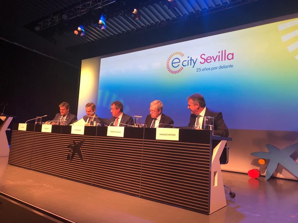 Alrededor de 200 personas han asistido en CaixaForum Sevilla a la presentación de #eCitySevilla, al que están invitadas a participar las 503 empresas y entidades que forman parte del PCT Cartuja, que pueden informarse sobre el proyecto o mostrar su voluntad de adhesión en la dirección de correo electrónico ecitysevilla@pctcartuja.es
