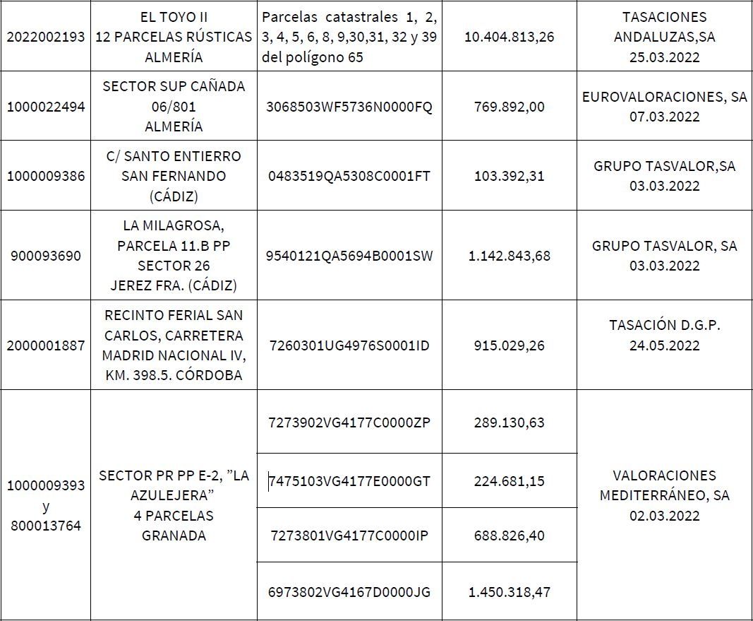 Entre la treintena de activos que salen a subasta pública, se encuentran tres grandes suelos residenciales localizados en las provincias de Sevilla, Granada y Almería y cuyo valor de tasación conjunto se eleva a 35 millones de euros. Al contar con un valor de mercado individual superior a los 6 millones de euros se exige obtener la autorización previa del Consejo de Gobierno de la Junta de Andalucía para su venta, que fue concedida en su reunión del pasado 31 de mayo.