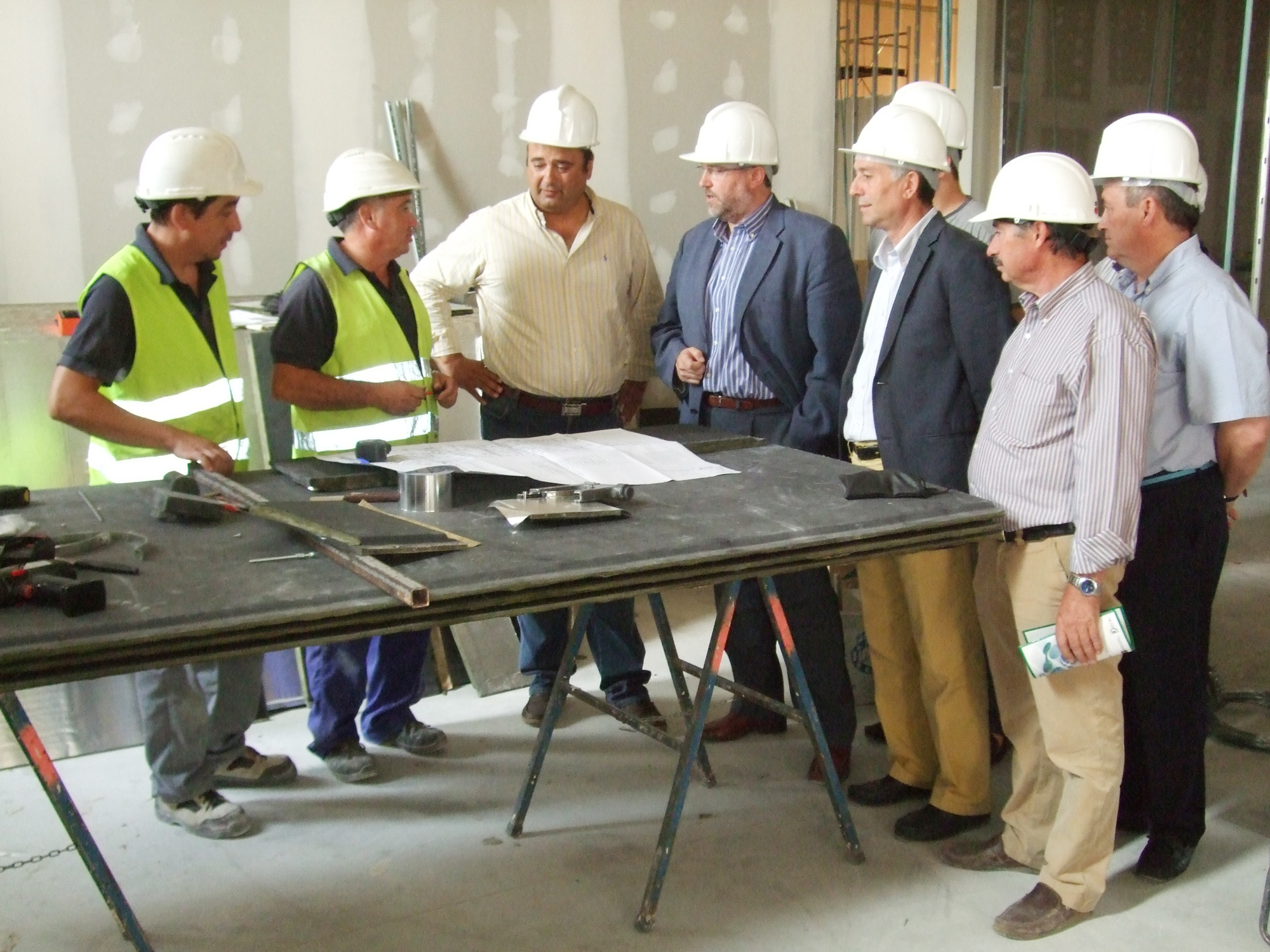 El delegado provincial de Economía, Innovación y Ciencia de la Junta de Andalucía, Manuel Gabriel Pérez; el concejal del Ayuntamiento de Martos, Francisco Delgado y el presidente de Andaltec, Francisco Buenaño, han visitado hoy las obras de adecuación del edificio 2 de la nueva sede de Andaltec, en las que se trabaja desde hace varios meses. Según las previsiones, los trabajos, que cuentan con un presupuesto de 1,3 millones de euros, estarán terminados para finales de 2012 y se espera que puedan permitir la generación de una decena de puestos de trabajo de alta cualificación una vez que esté en funcionamiento.