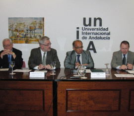 El expresidente de la Junta de Andalucía y consejero del Consejo Consultivo de Andalucía, Rafael Escuredo; el consejero de Economía, Innovación, Ciencia y Empleo, Antonio Ávila; el rector de la Universidad Internacional de Andalucía, Juan Manuel Suárez Japón, y el presidente del Consejo Consultivo de Andalucía y Catedrático de Derecho Constitucional de la Universidad de Almería, Juan Cano Bueso.