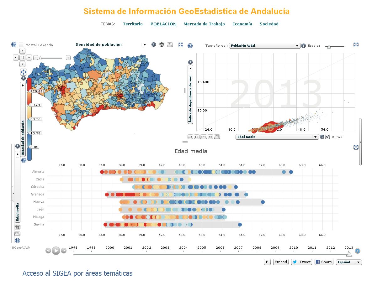 Su atractivo diseño visual ayuda a la difusión de datos estadísticos asociados a un territorio del ámbito andaluz (municipios, grandes dominios territoriales (POTA), distritos hidrográficos, según relieve o usos del suelo) proporcionando una interfaz sencilla para la elaboración de análisis descriptivos de datos y mapas de coropletas, acercando estas técnicas a usuarios no especializados.