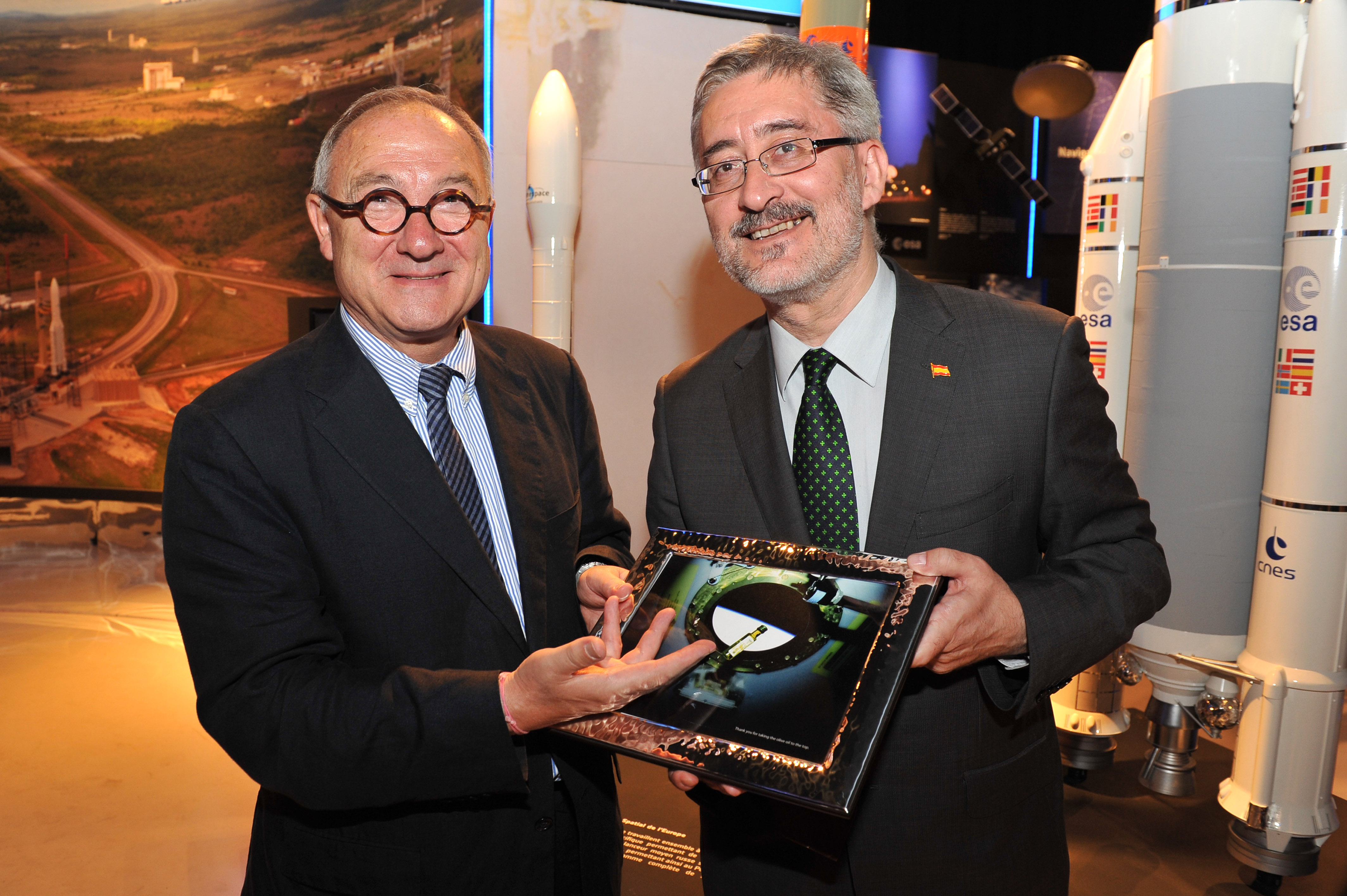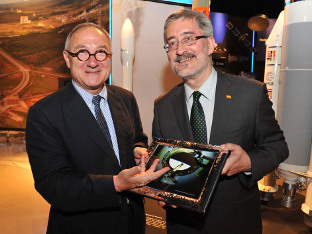 El Consejero de Economía entregando un obsequio al director general de la Agencia Espacial Europea.