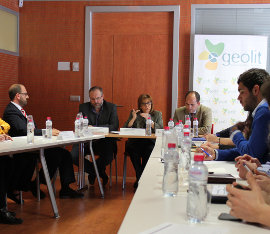 La delegada del Gobierno en Jaén, el delegado territorial de Economía (izquierda) y el gerente de Geolit en el encuentro con empresas.
