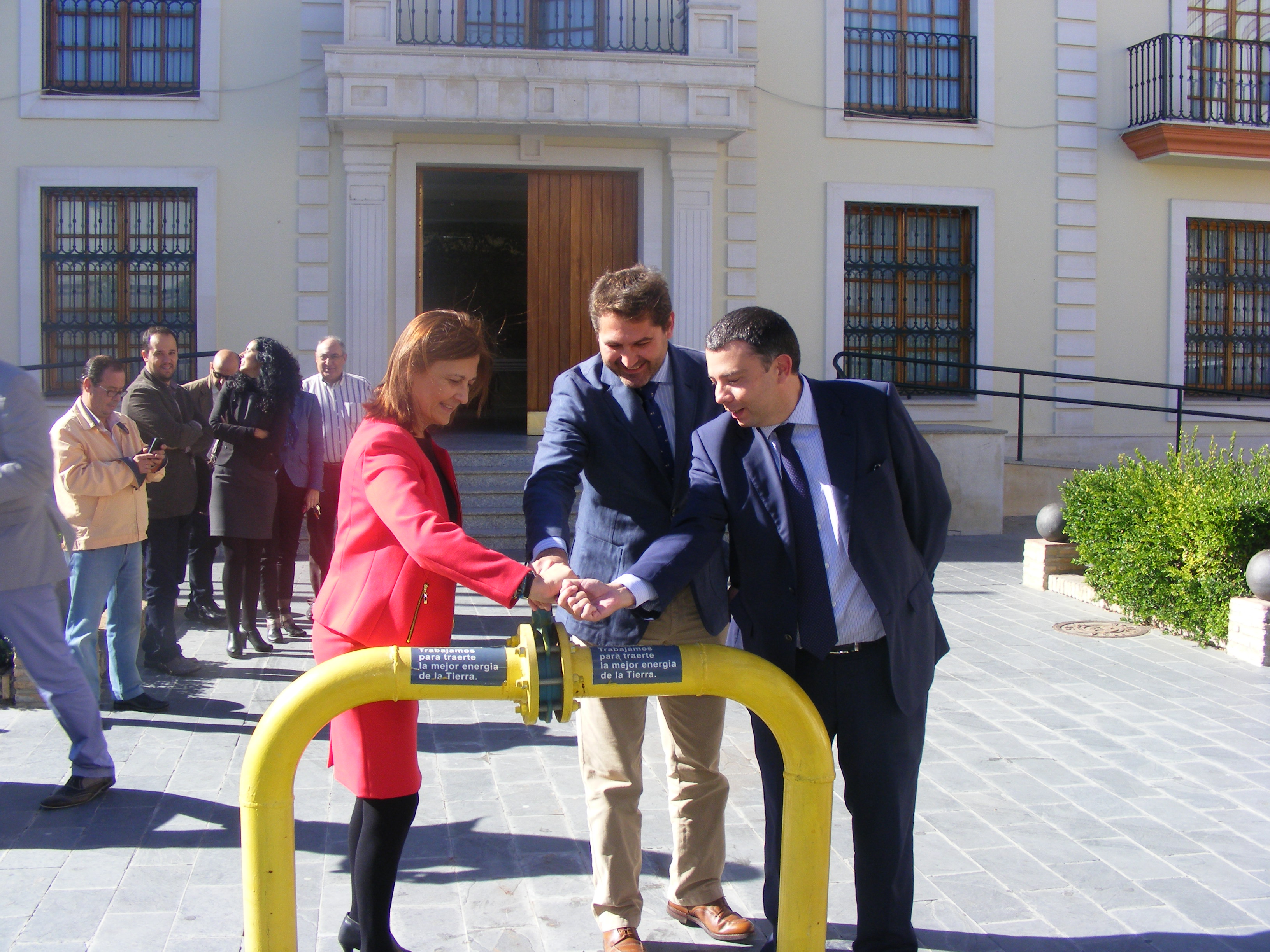 La delegada de Economía en Sevilla, Aurora Cosano, El alcalde de Bollullos, Francisco Godoy y el Director General de Gas Natural, Juan José Picón abren la llave de Gas Natural.