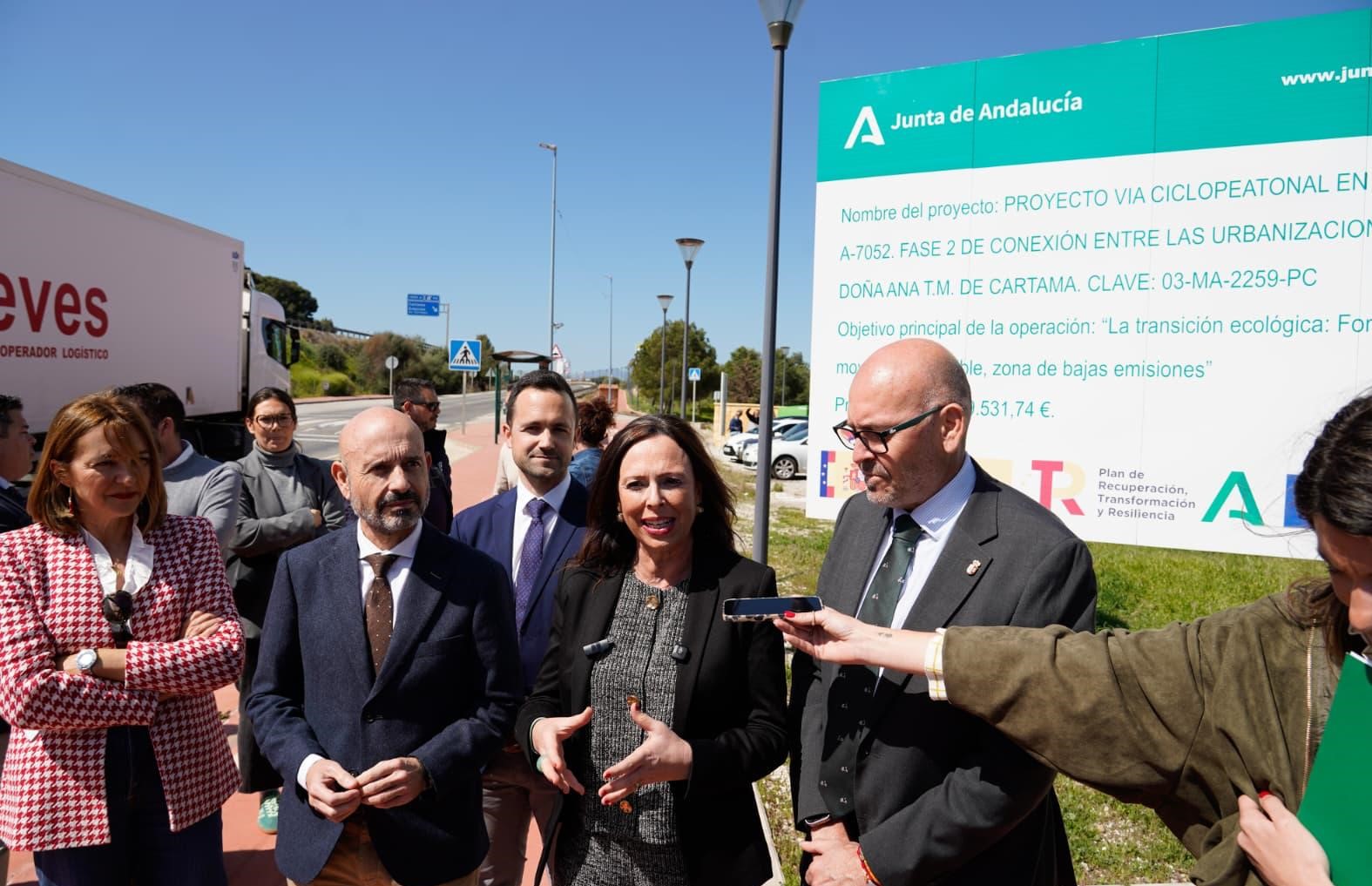 La Junta de Andalucía ha completado la vía ciclopeatonal de la travesía de Cártama y con ello, un trazado seguro por los diferentes núcleos del municipio. La consejera de Fomento, Articulación del Territorio y Vivienda, Rocío Díaz, ha visitado este nuevo tramo de 2,2 kilómetros más de carril para peatones y ciclistas junto a la A-7052, que conecta las urbanizaciones de Atalaya y Doña Ana.
