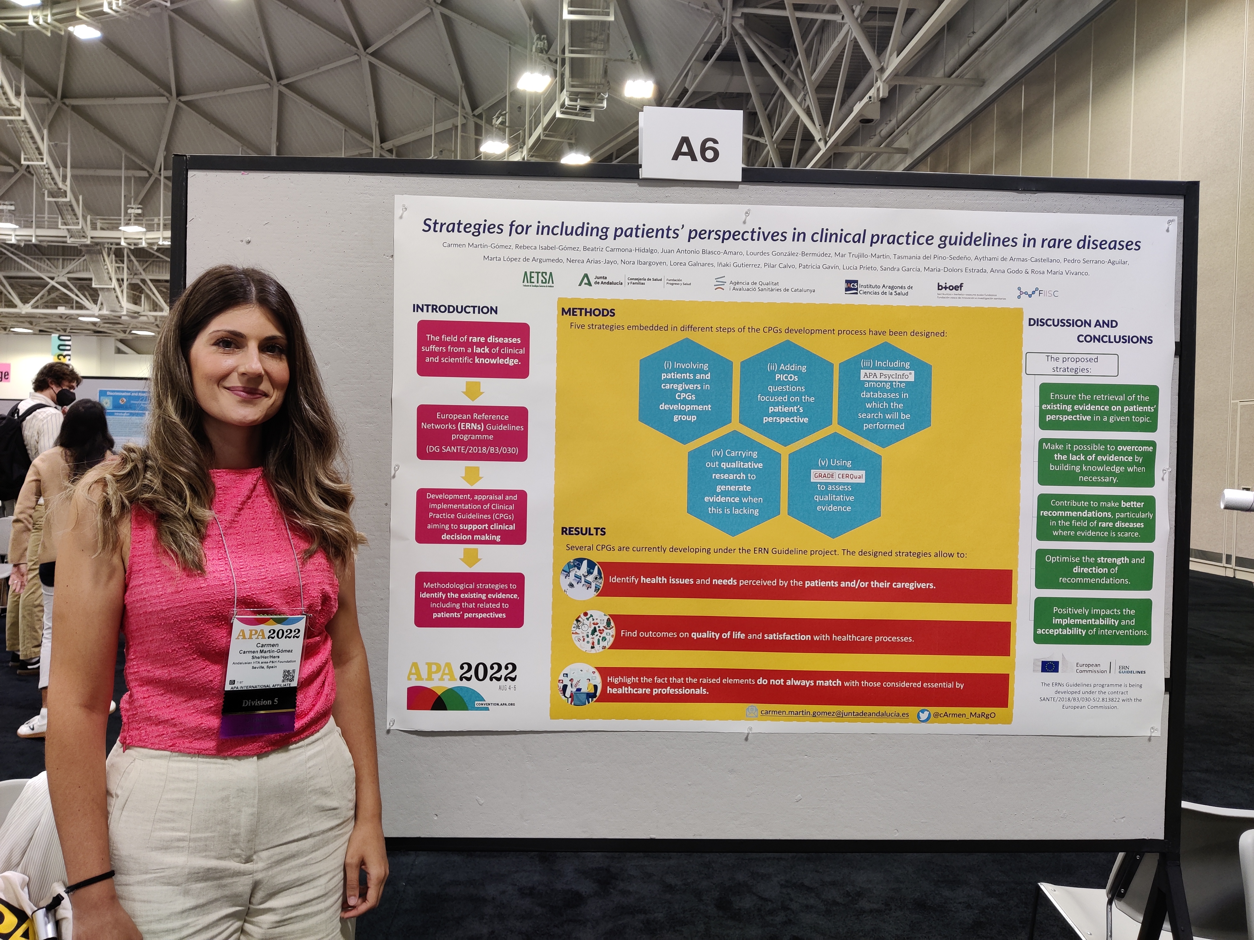 La investigadora postdoctoral Carmen Martín ha presentado en la convención anual de la Asociación Americana de Psicología (APA), celebrada en Minneapolis (Estados Unidos), los avances en el proyecto europeo que coordina Andalucía para el desarrollo de guías de práctica clínica en enfermedades raras, a través del Área de Evaluación de Tecnologías Sanitarias de la Fundación Progreso y Salud (FPS) de la Consejería de Salud y Consumo. En concreto, se han expuesto las estrategias metodológicas para la inclusión de la perspectiva de pacientes en las guías.