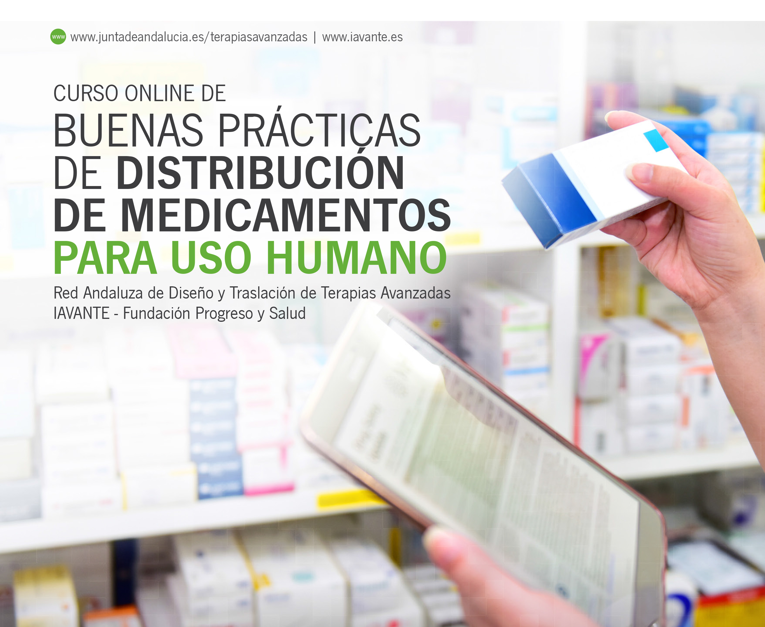 Organizado por la Fundación Progreso y Salud, a través de su Red Andaluza de Diseño y Traslación de Terapias Avanzadas y su Línea IAVANTE de formación, este curso se desarrollará íntegramente online y está destinado a profesionales vinculados con la distribución de los medicamentos como, por ejemplo, personal sanitario, de farmacias hospitalarias, de laboratorios GMP o de entidades que desarrollan esta actividad.