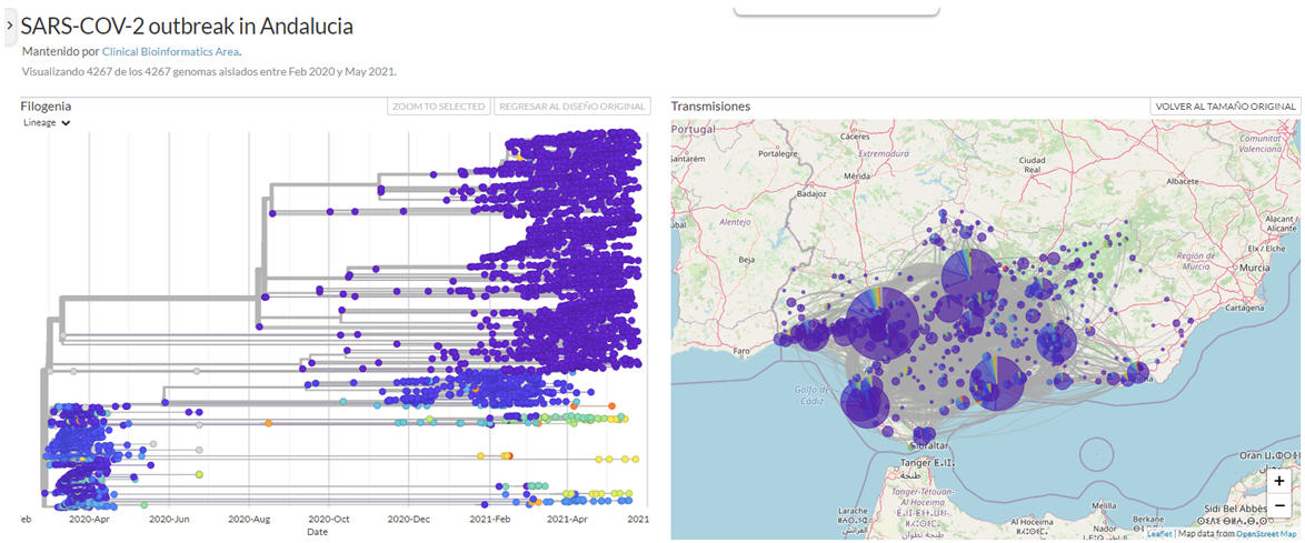 Para obtener esta información y conocer más en profundidad sobre esta enfermedad, se ha secuenciado un total de 4.267 genomas del Sars-CoV-2 en los dos hospitales de referencia designados para ello: el Hospital Virgen del Rocío de Sevilla, para secuenciar las muestras que proceden de centros hospitalarios y de Atención Primaria de la zona occidental de Andalucía (las provincias de Cádiz, Córdoba, Huelva y Sevilla); y el Hospital San Cecilio de Granada, para las que proceden de la zona oriental (Almería, Granada, Jaén y Málaga). La información obtenida ha sido analizada en el Área de Bioinformática Clínica de la Fundación Progreso y Salud, en donde se interpreta y se configura un mapa epidemiológico del virus.