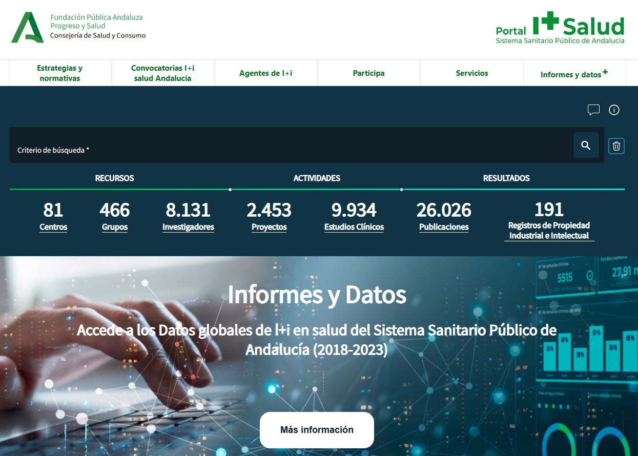 Este portal ofrece informes relevantes sobre la I+D+i en la sanidad andaluza; datos de personas investigadoras; grupos; proyectos de investigación o estudios clínicos; y publicaciones y registros de propiedad industrial e intelectual, entre otros aspectos, así como herramientas para el análisis y las búsquedas específicas de datos.