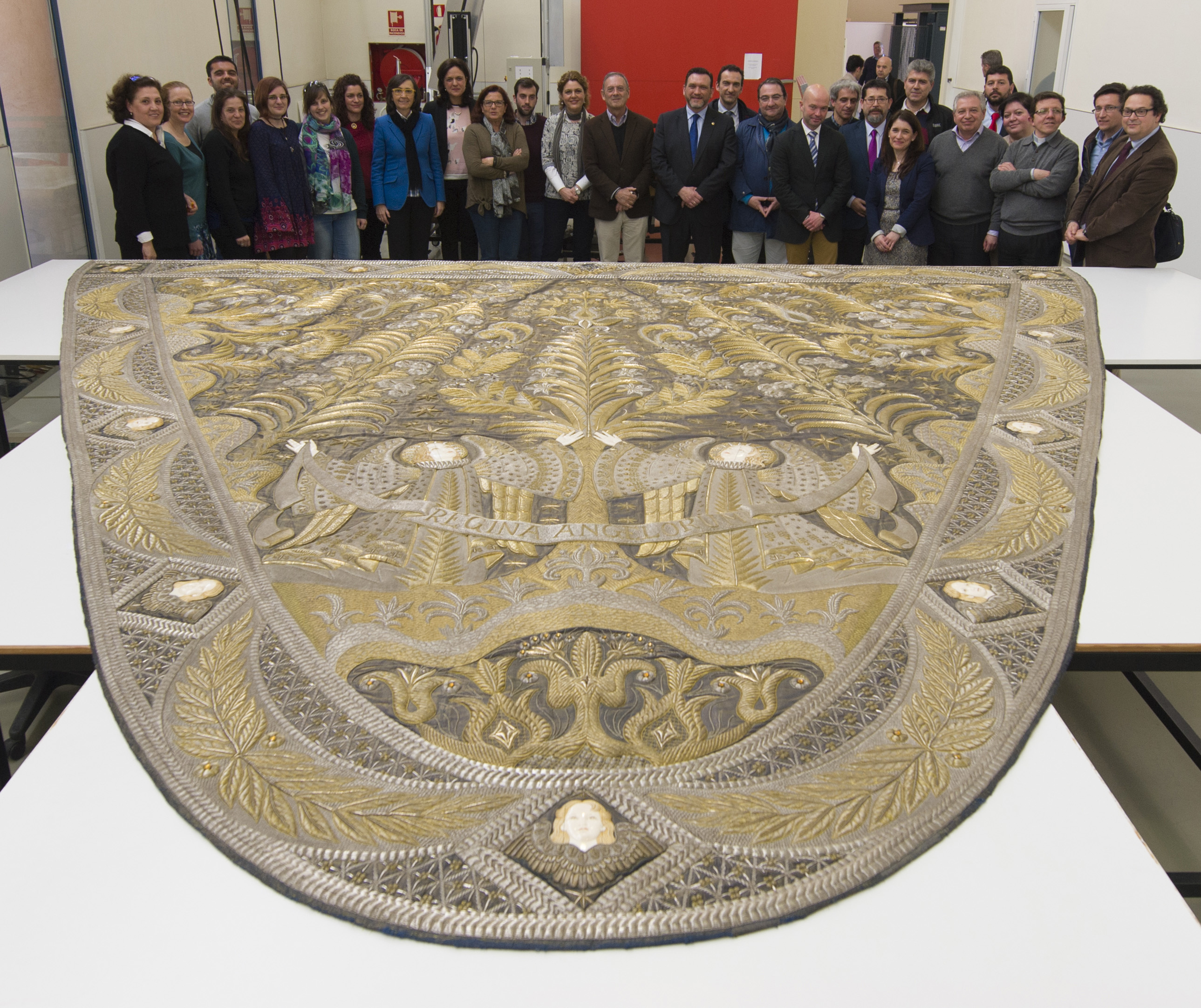 La consejera de Cultura, Rosa Aguilar, y el Alcalde de la Hermandad de los Negritos de Sevilla, Felipe Guerra Vázquez, han presentado hoy en la sede del Instituto Andaluz del Patrimonio Histórico (IAPH) el resultado de la restauración del manto procesional de la Virgen de los Ángeles. Se trata de una excepcional pieza diseñada en 1958 por Juan Miguel Sánchez Fernández, bordado por las Trinitarias y que fue estrenado en la tarde del Jueves Santo de 1961, en el que ha trabajado durante nueve meses un equipo multidisciplinar compuesto por profesionales en restauración, historia del arte, química, paleobiología y conservación preventiva.