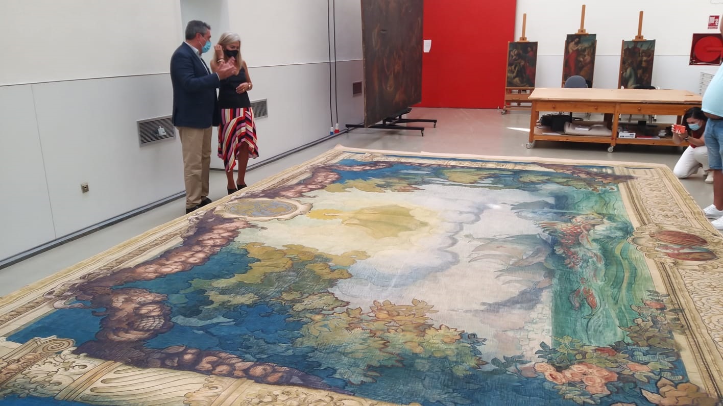 La consejera de Cultura y Patrimonio Histórico, Patricia del Pozo, ha visitado este lunes el taller de restauración de tejidos del Instituto Andaluz del Patrimonio Histórico (IAPH), donde se encuentran las sargas de la colección del pintor Gustavo Bacarisas (1873-1971) que habitualmente decoran la sala de fiestas del Palacio Gótico del Real Alcázar de Sevilla. En concreto, se trata de cuatro piezas textiles fruto del encargo para decorar el Pabellón Real de la Exposición Iberoamericana de 1929.