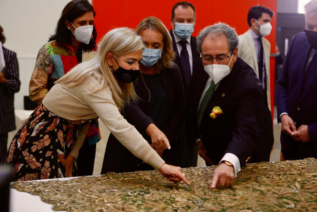La consejera de Cultura y Patrimonio Histórico, Patricia del Pozo, ha presidido en la sede del Instituto Andaluz del Patrimonio Histórico (IAPH) el acto de depósito del Manto de la Coronación de María Santísima de la Esperanza Macarena, uno de los tres mantos procesionales de la titular, que será intervenido por los profesionales del taller de restauración de tejidos del instituto durante un período de 14 meses.