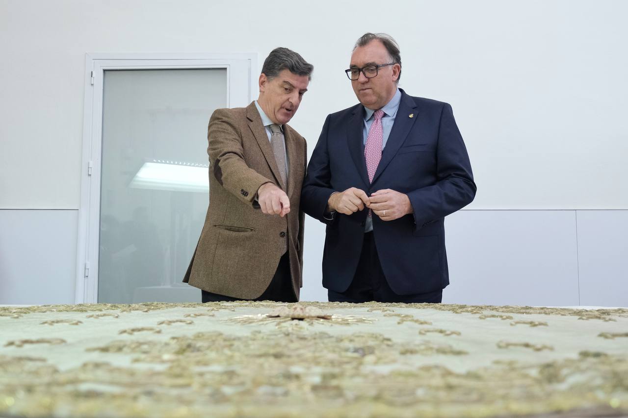 El consejero de Turismo, Cultura y Deporte, Arturo Bernal, ha presentado en el Instituto Andaluz del Patrimonio Histórico (IAPH) la restauración del conjunto textil ‘de los Montpensier’ -compuesto por manto, traje de la Virgen y dos túnicas del Niño-, bienes que forman parte del ajuar de la Virgen del Rocío. En el acto han estado también presentes el director del IAPH, Juan José Primo, y el presidente de la Hermandad Matriz de Almonte (Huelva), Santiago Padilla.