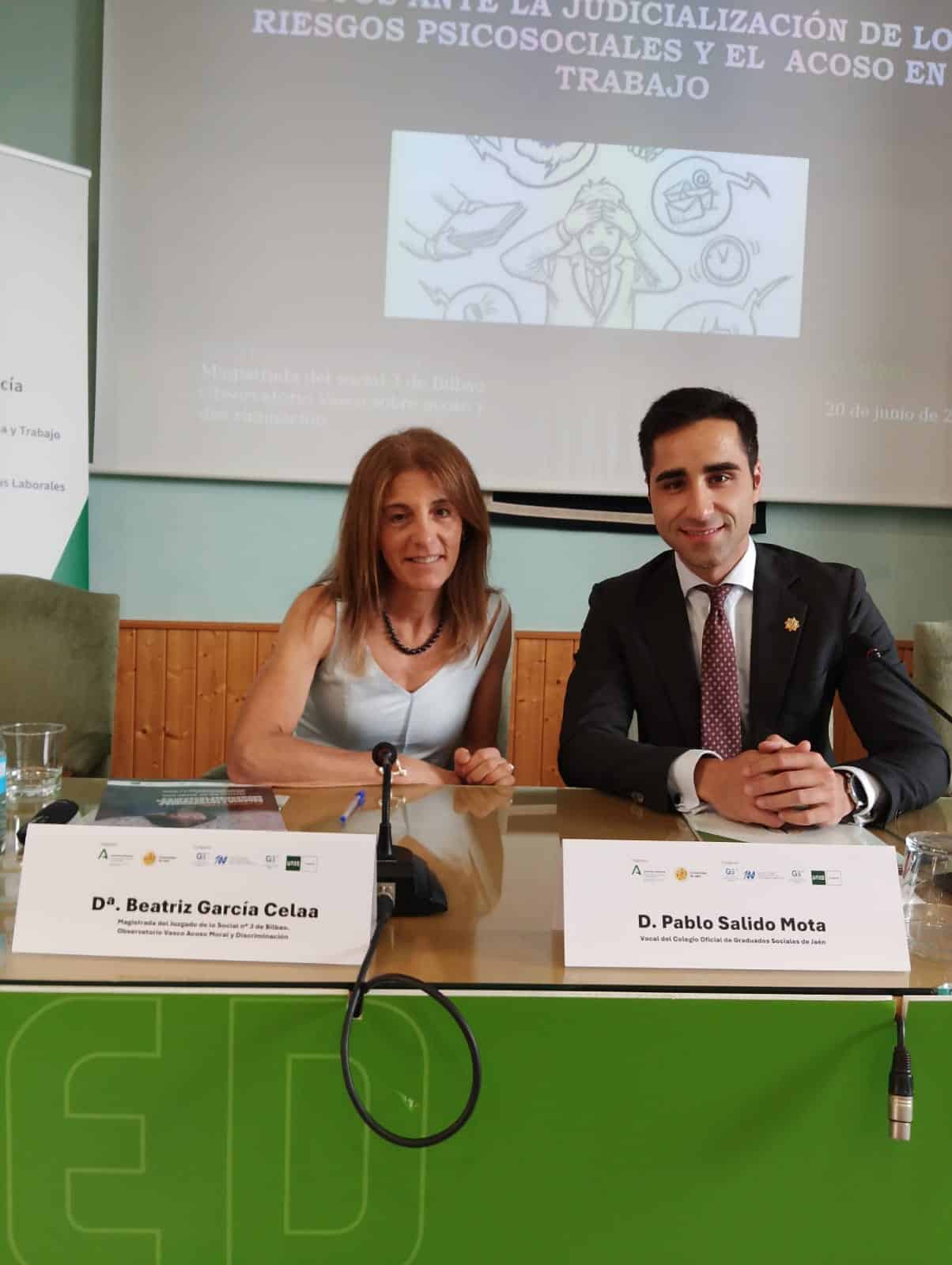 Con posterioridad, tuvo lugar la ponencia de la Magistrada especialista Dª Beatriz García Celáa, titular del juzgado de lo social n. 1 de Bilbao y miembro del prestigioso Observatorio vasco sobre acoso y discriminación. La Magistrada (que fue presentada por D. Pablo Salido Mota, de la Junta Directiva del Colegio Oficial de Graduados Sociales de Jaén, como se comentó) hizo una detallada y muy ilustrativa exposición de la visión y tratamiento de la violencia y el acoso en el trabajo en la jurisprudencia y doctrina judicial de la última década. Aunque esta cuestión no se trata solo en el orden social, también en otros, como el penal, la ponencia versó solo en el primero (que incluye también al empleo público funcionarial).