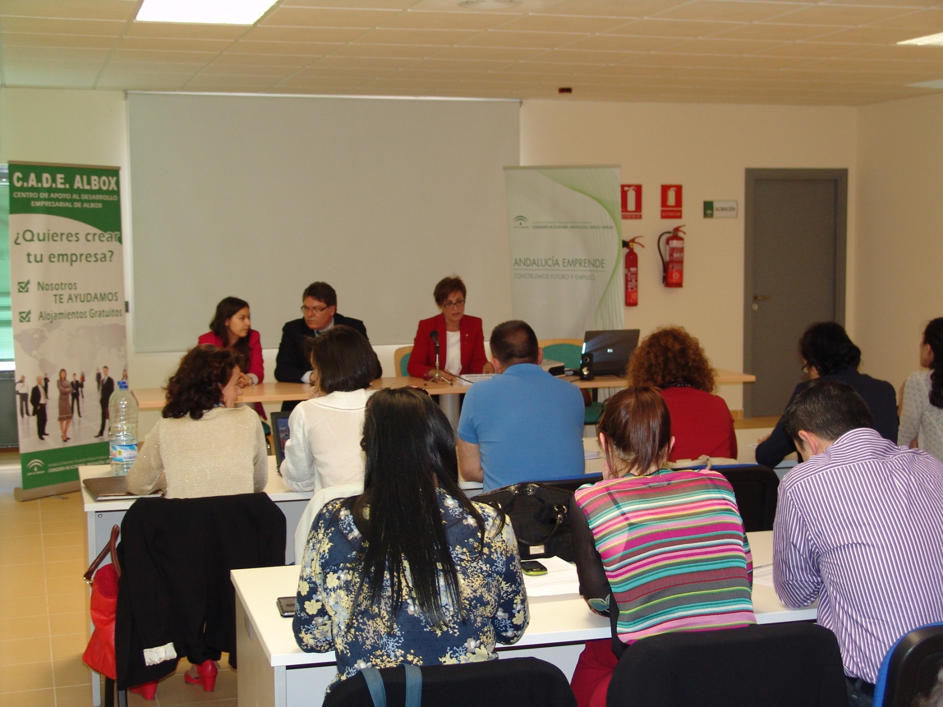 La delegada territorial de Economía, Innovación, Ciencia y Empleo, junto al alcalde de Albox y una concejal del municipio, en la presentación de la jornada en el CADE albojense.