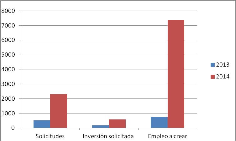 Es significativo el incremento de las solicitudes presentadas, lo que representa un indicador de la reactivación de la actividad empresarial y también el mayor compromiso de creación de empleo. En el primer cuatrimestre de 2013, el compromiso de generación fue de 1,4 empleos por proyecto (750 empleos a crear en 517 nuevos proyectos empresariales), mientras que en el mismo periodo de 2014 asciende a 3,1 empleos por proyecto presentado.