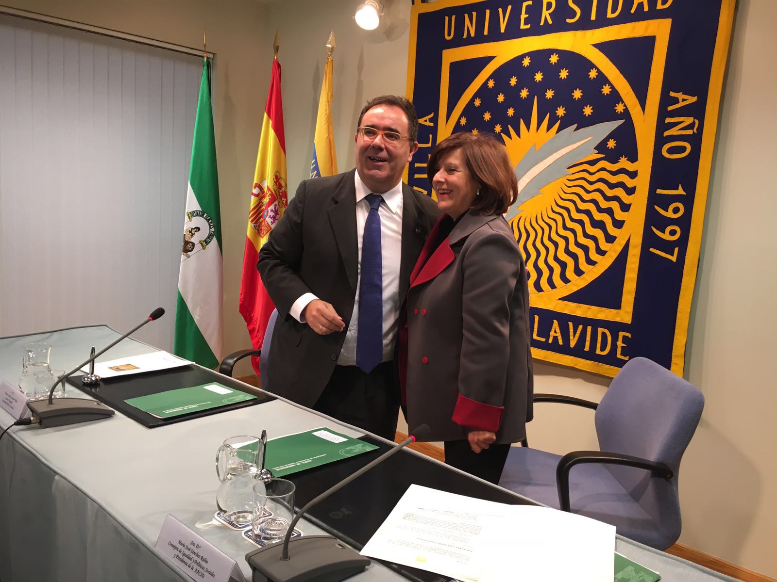 En el día de hoy, la consejera de Igualdad y Políticas Sociales, María José Sánchez Rubio, y el rector de la Universidad Pablo de Olavide, de Sevilla, Vicente C. Guzmán Fluja, han presentado el convenio específico de colaboración entre ambos organismos, que está compuesto por cuatro proyectos por un importe de 250.000 euros para el periodo 2015-2017.