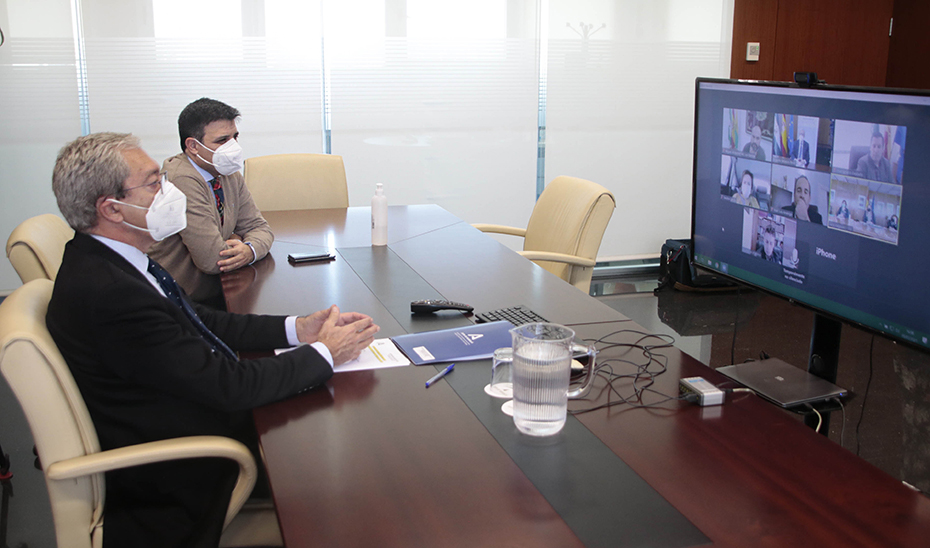 El consejero de Transformación Económica, Industria, Conocimiento y Universidades, Rogelio Velasco, la secretaria de Estado de Energía, Sara Aegesen, y la Federación Española de Municipios y Provincias (FEMP) han suscrito, de forma telemática, los protocolos de actuación que darán soporte a los convenios de Transición Justa para el cierre de las centrales térmicas de Carboneras (Almería), Puente Nuevo-Valle del Guadiato (Córdoba) y Los Barrios (Cádiz).