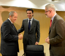 El consejero de Economía, Antonio Ávila, saluda al ministro de Industria, José Manuel Soria, y al consejero de Empresa de Cataluña, Felip Puig, antes de la Conferencia sectorial de Energía celebrada en Madrid.
