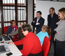 Al fondo de pie, el delegado de Economía. Innovación, Ciencia y Empleo, José Ignacio Expósito, escuchando las explicaciones de las usuarias del Guadalinfo de Conquista.