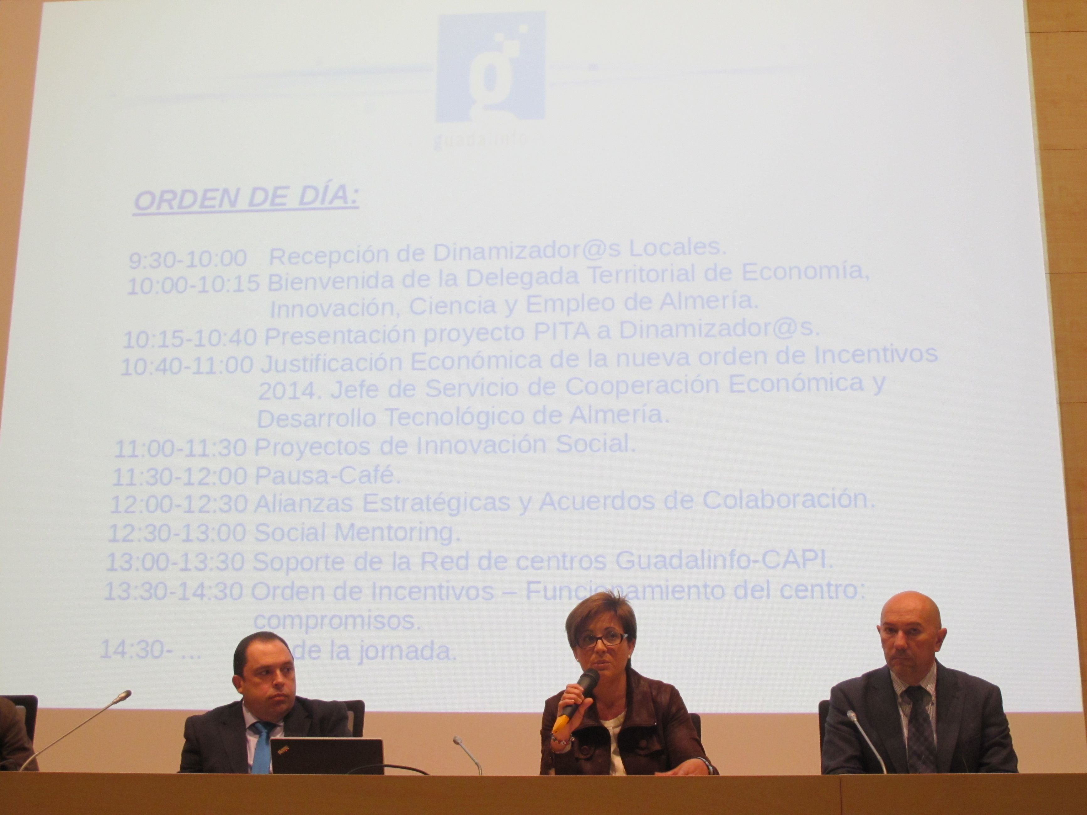 La red de centros Guadalinfo y Centros de Acceso Público a Internet (CAPIs) de la provincia contará con una inversión superior a 2 millones de eu-ros durante 2014 para su mantenimiento, según ha explicado hoy la delegada territorial de Economía, Innovación, Ciencia y Empleo, Adriana Valverde, en el transcurso de un encuentro de trabajo con dinamizadores y dinamizadoras de esta red que ha tenido lugar hoy en la sede del Parque Científico-Tecnológico de Almería, el PITA.