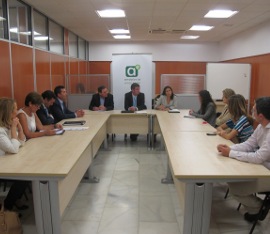 El secretario general de Innovación, Industria y Energía de la Junta de Andalucía, Vicente Fernández, junto a la delegada territorial de la consejería de Economía, Innovación, Ciencia y Empleo, Adriana Valverde y la directora del Territorio Sur de Telefónica, María Jesús Almazor, han dado a conocer hoy en un encuentro con el presidente de la Asociación de Empresarios del Mármol de Andalucía (AEMA), Antonio Martínez, y firmas de este sector el despliegue de red de fibra óptica FTTH que la compañía ha realizado en el polígono industrial Rubira Sola de Macael, que cuenta con unas 70 empresas, con el apoyo de la Junta de Andalucía.