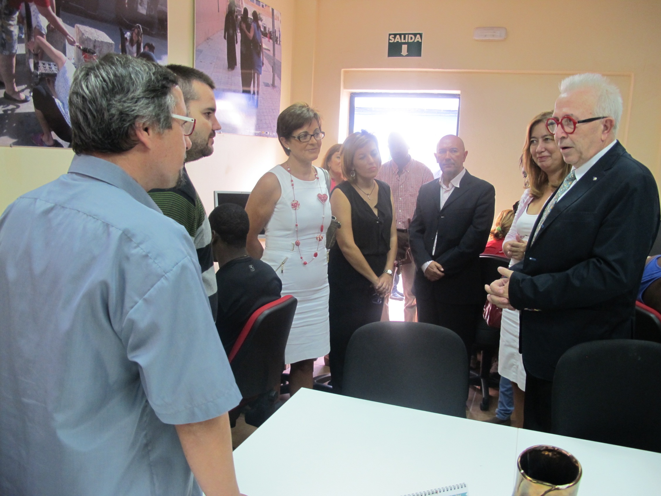De izquierda a derecha, responsables de Almería Acoge y el CAPI de La Fuentecica, las delegadas de Economía, Innovación, Ciencia y Empleo y del Gobierno, el jefe del servicio de Cooperación Económica y Desarrollo Tecnológico de la Delegación de Economía, la directora general de Telecomunicaciones y Sociedad de la Información y el consejero de Economía, Innovación, Ciencia y Empleo.
