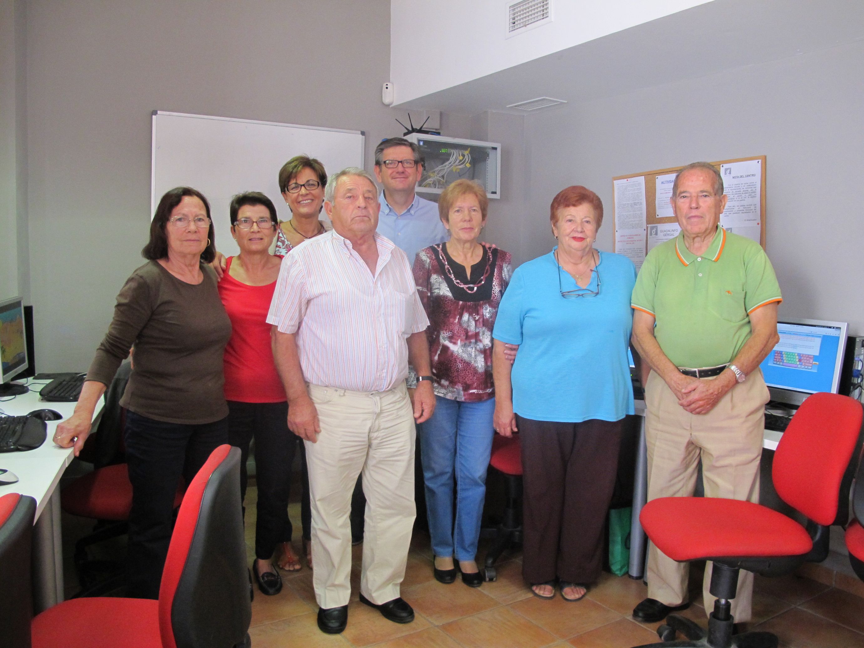 La delegada territorial de Economía, Innovación, Ciencia y Empleo junto al dinamizador del centro Guadalinfo de Gérgal, usuarios y usuarias.