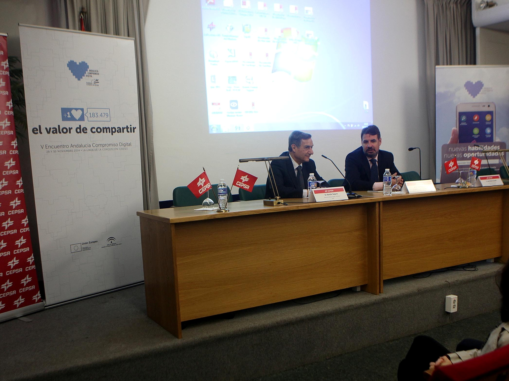 Las empresas mecenas del proyecto Andalucía Compromiso Digital (ACD), iniciativa de la Consejería de Economía, Innovación, Ciencia y Empleo para mejorar las competencias digitales de los andaluces, se han reunido en la refinería de Cepsa en San Roque (Cádiz) para confirmar su apoyo al programa, en el marco del V Encuentro de Voluntariado Digital Andaluz que se celebra en este fin de semana en La Línea de la Concepción (Cádiz).
