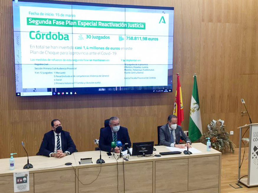 La Consejería de Turismo, Regeneración, Justicia y Administración Local va a invertir un total de casi 1,4 millones de euros en medidas de autorrefuerzo de personal en los juzgados cordobeses con el Plan Especial de Reactivación de la Administración de Justicia, cuya segunda fase ha arrancado esta misma semana.