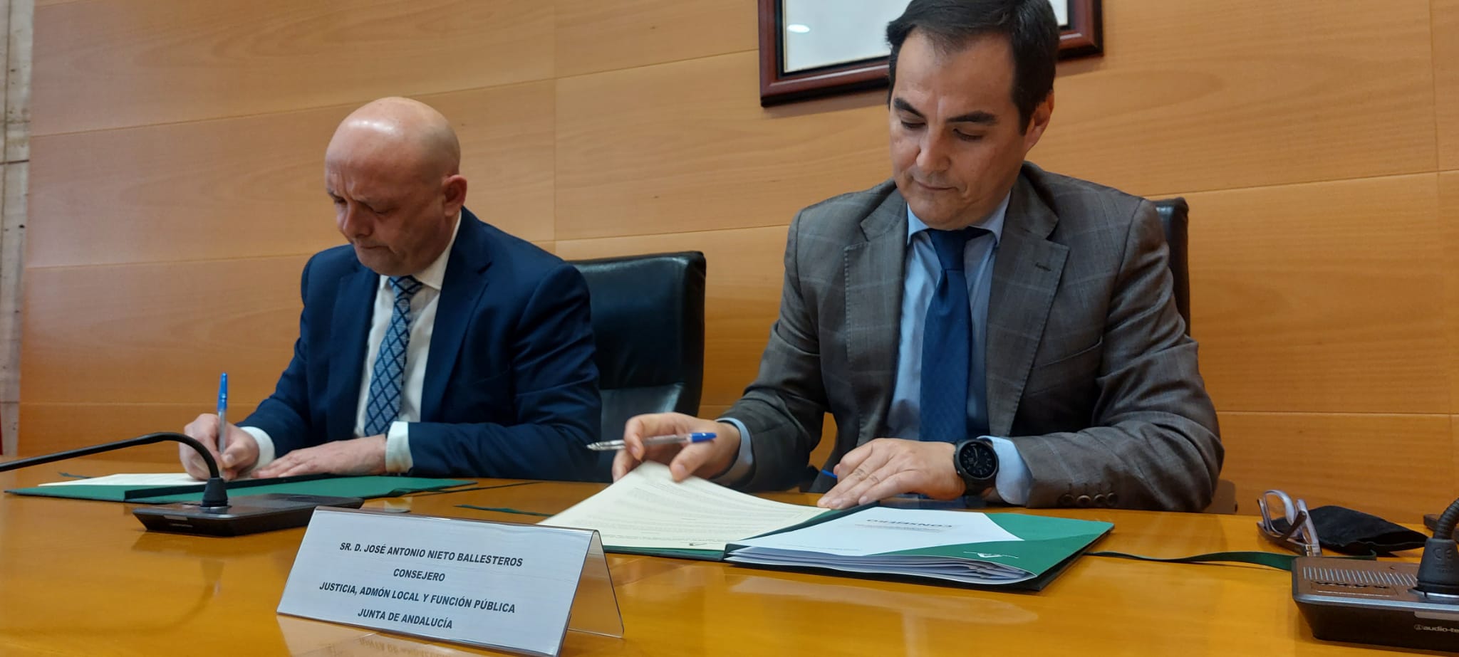 El consejero de Justicia, Administración Local y Función Pública, José Antonio Nieto, y el alcalde de Dos Hermanas (Sevilla), Francisco Rodríguez, han suscrito hoy un protocolo para que la novena ciudad andaluza tenga una “gran sede judicial” mediante la construcción de un edificio anexo al actual para ampliar el espacio disponible.